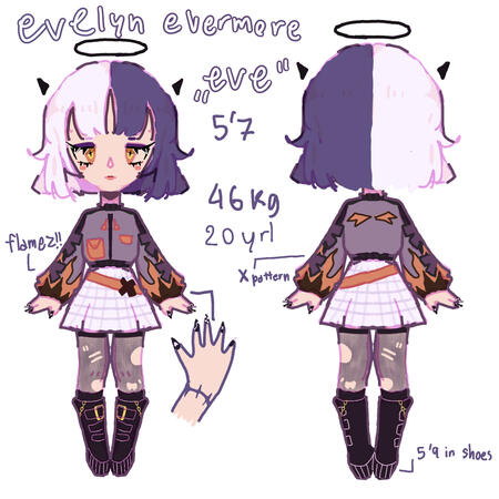 as i have mentioned she is recovering from anorexia which she has ever since she was in middle school. therefore, she is quite skinnyher hair was fully white but she dyed it half purple to have it match with her younger brotheron both of her wrist there are birthmarks from the cursed passed from her mother (more in lilith's story)
